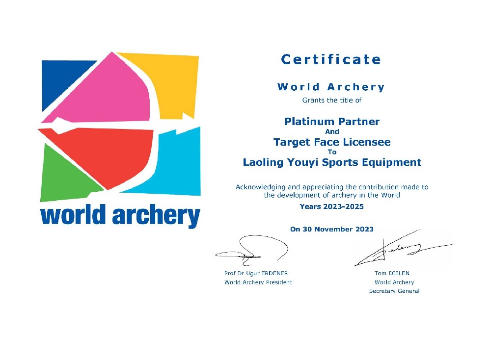 目前,主要生產和銷售射箭比賽及訓練專用器材,包括:箭靶、靶紙、靶架、號碼牌、風向旗、計時記分器等場地器材設備;反曲弓、復合弓、傳統(tǒng)弓、瞄準器、防震桿等弓箭裝備;箭壺、護胸、護臂、護指等各類箱包護具。公司所生產的射箭器材已通過國際射箭聯(lián)合會及中國射箭協(xié)會CAA認證。